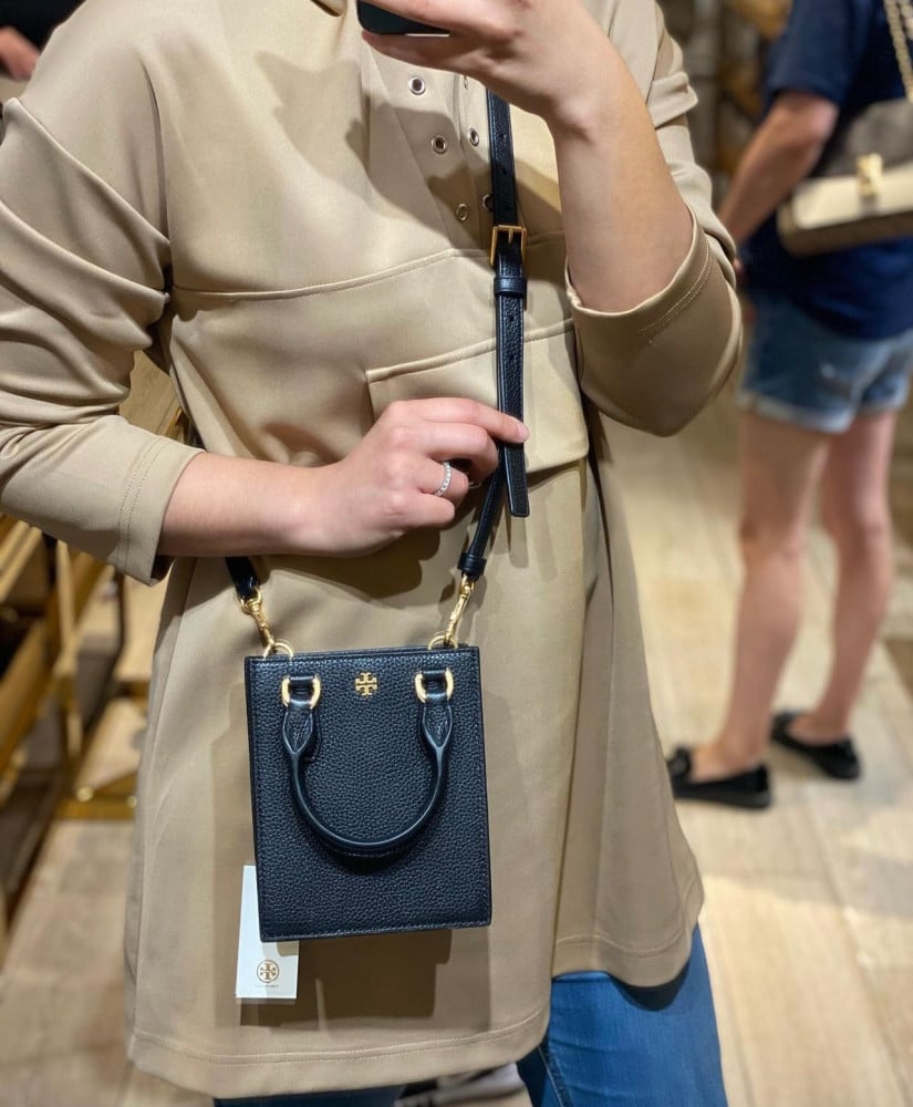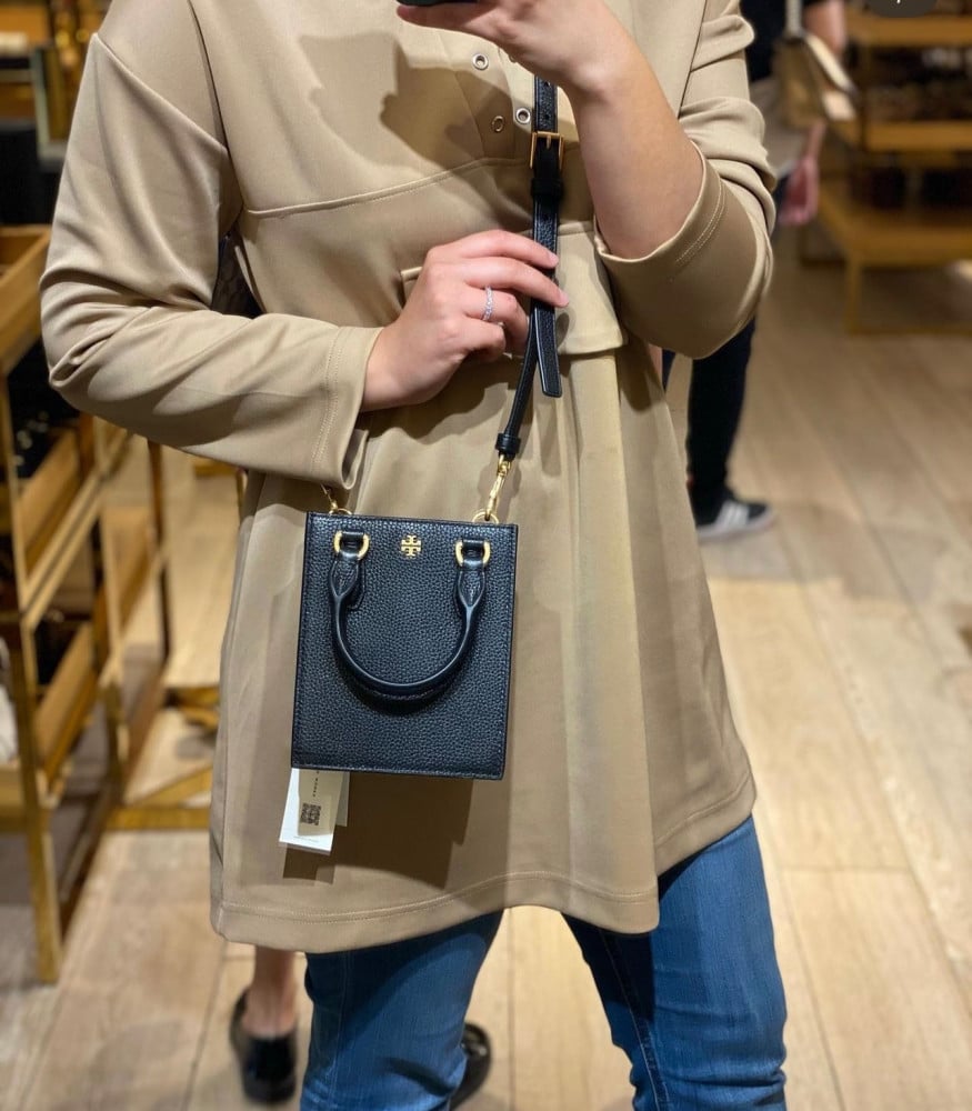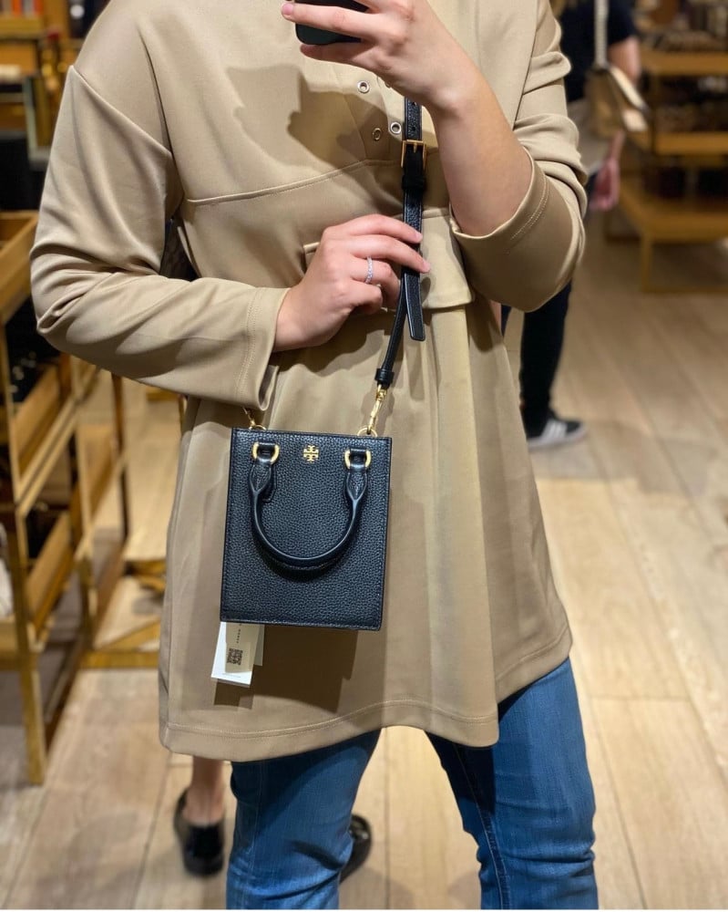 التفاصيل داخلية: بطانة قماشية مخصصة من Tory Burch و3 فتحات لبطاقة الائتمان مع مقبض مزدوج وسير اضافي قابل للازالة .